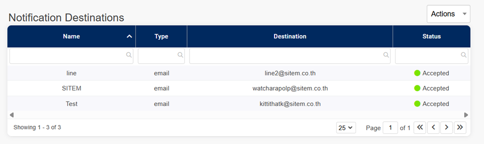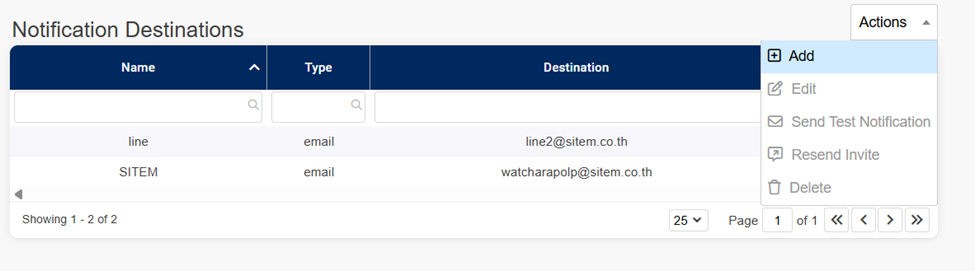 - ถ้าต้องการเพิ่มอีเมล์ที่จะได้รับการแจ้งเตือน ให้ไปที่ Settings > Notification Destinations กด Actions ที่มุมขวาบน จากนั้น กด Add