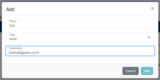 - ตั้งชื่อ เลือก type เป็น email จากนั้นกรอกอีเมล์ลงไป แล้วกด Add